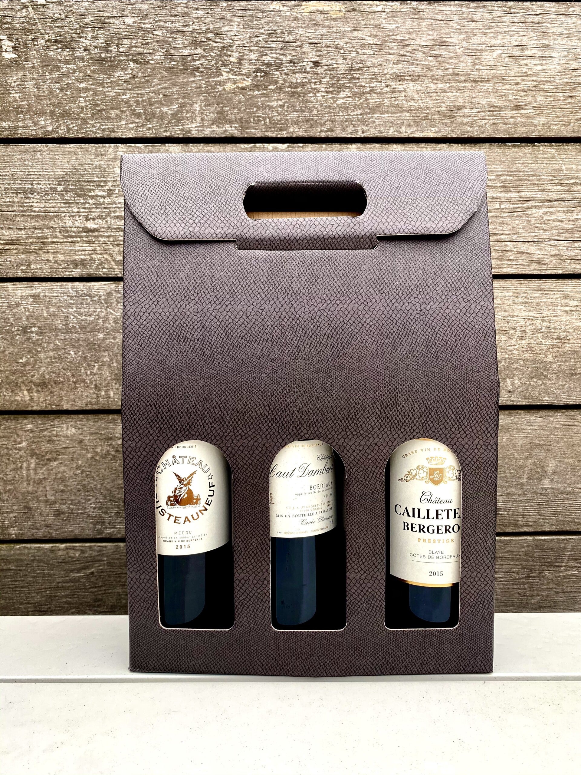Hoogwaardige kartonnen doos voor 3 wijnflessen.